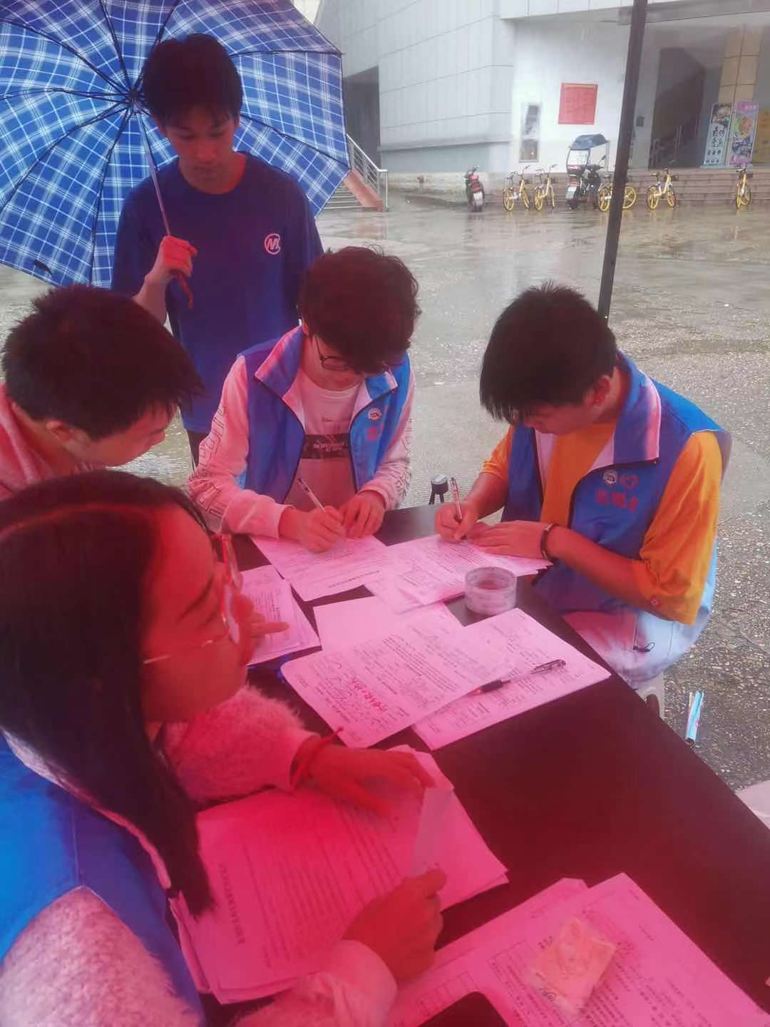 志愿者帮助同学们完成登记,他们认真而坚定,忙碌而有序,一份份登记表,就是一颗颗炽热的爱心。