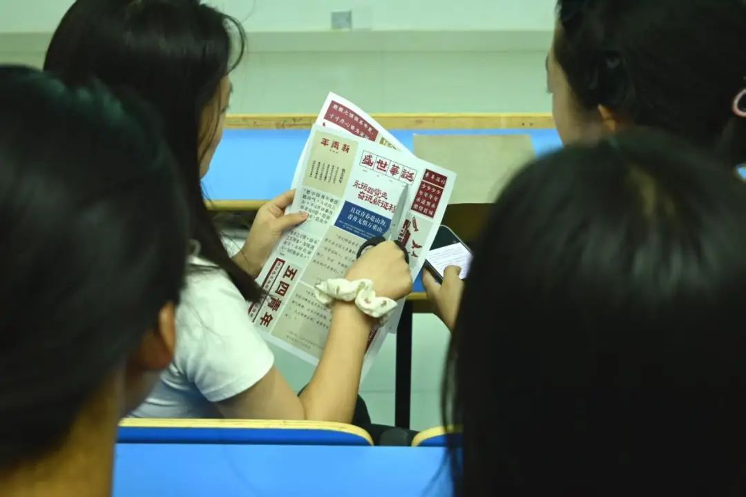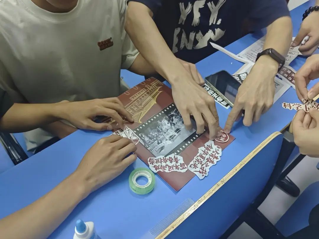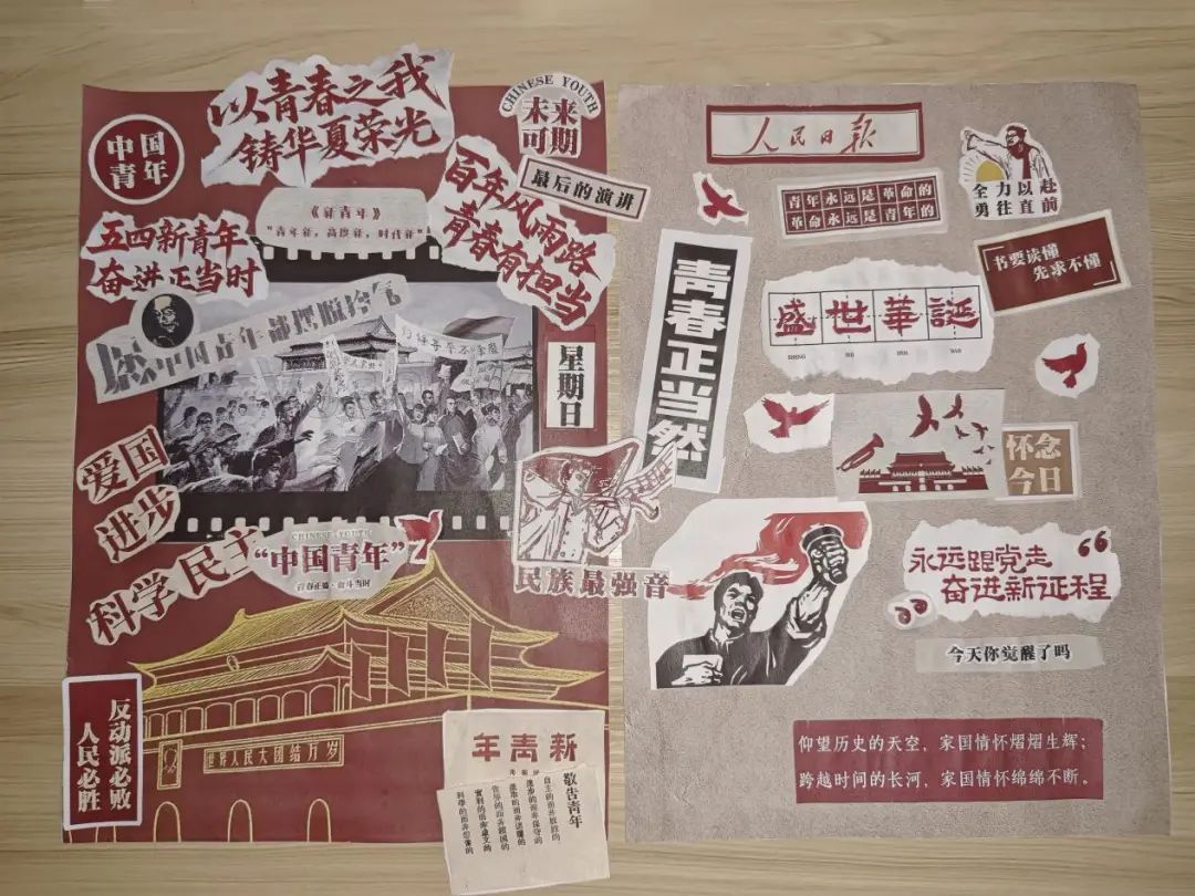 在教室里青年团员们围坐在长桌旁,指尖翻飞着红金两色卡纸,剪刀裁出的五角星与齿轮交叠成青春图腾。有人用碎布拼贴出麦穗环绕的火炬,有人将老照片与手写誓词叠印成时光胶片。当最后一片红绸拼成跃动的火炬,满墙斑斓剪影在晚风中簌簌作响,恰似百年来代代青春的信仰絮语,在拼贴重构中迸发新生。