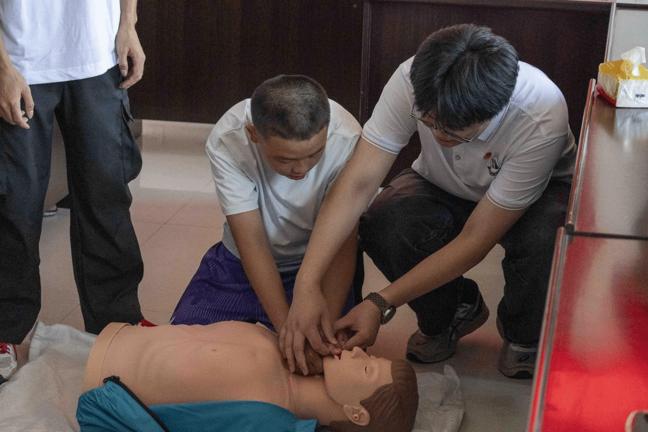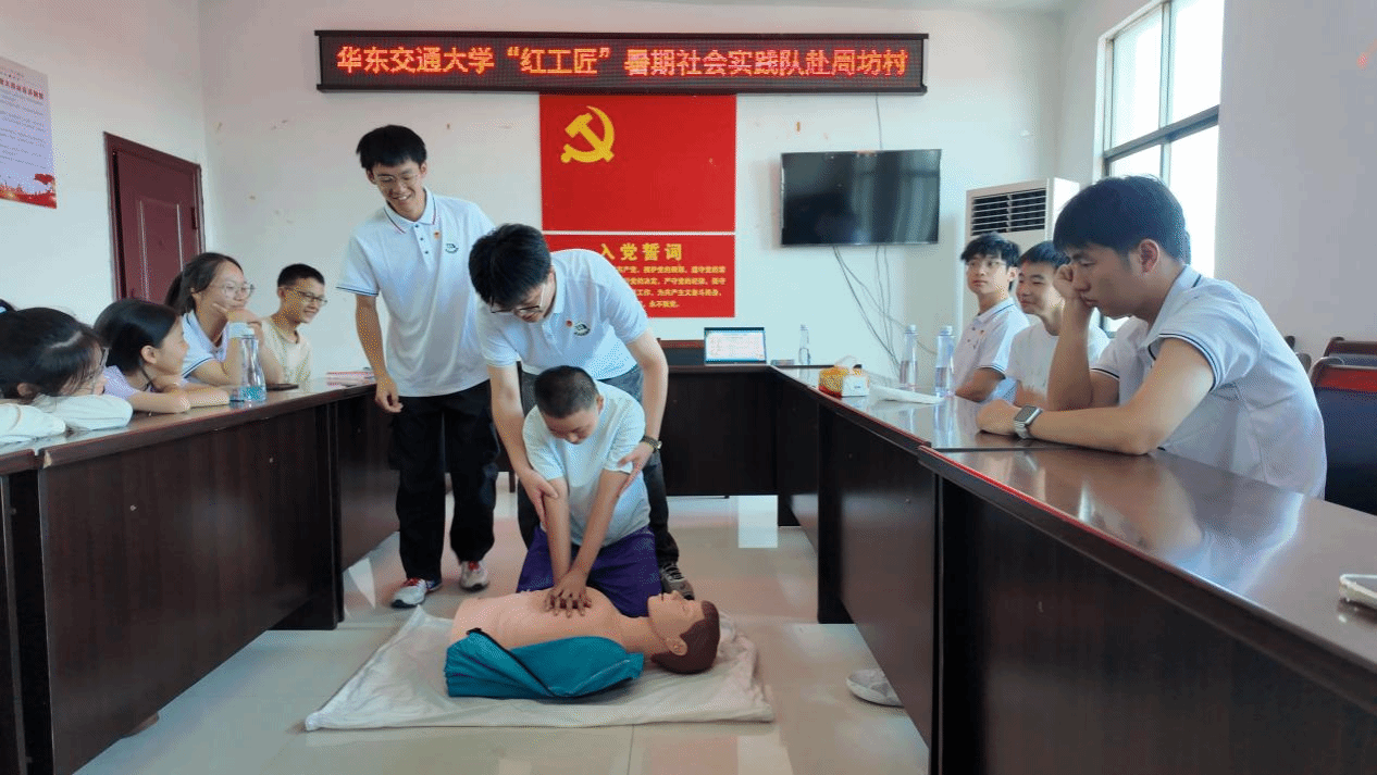 实践演练环节中,队员们以防溺水为主题自然过渡,引入心肺复苏急救技能培训。实践队依托专业模拟人教具,进行标准化操作演示,对胸外按压的精准定位、按压深度与频率的控制、开放气道的正确手法、人工呼吸的规范流程等关键要点进行细致拆解。在孩子们实践的过程中,队员们耐心纠正孩子们的动作偏差,鼓励他们反复练习。通过实操训练,孩子们不仅掌握了科学规范的急救技能,更深刻理解了生命的宝贵,树立起“敬畏生命、珍视生命”的意识。