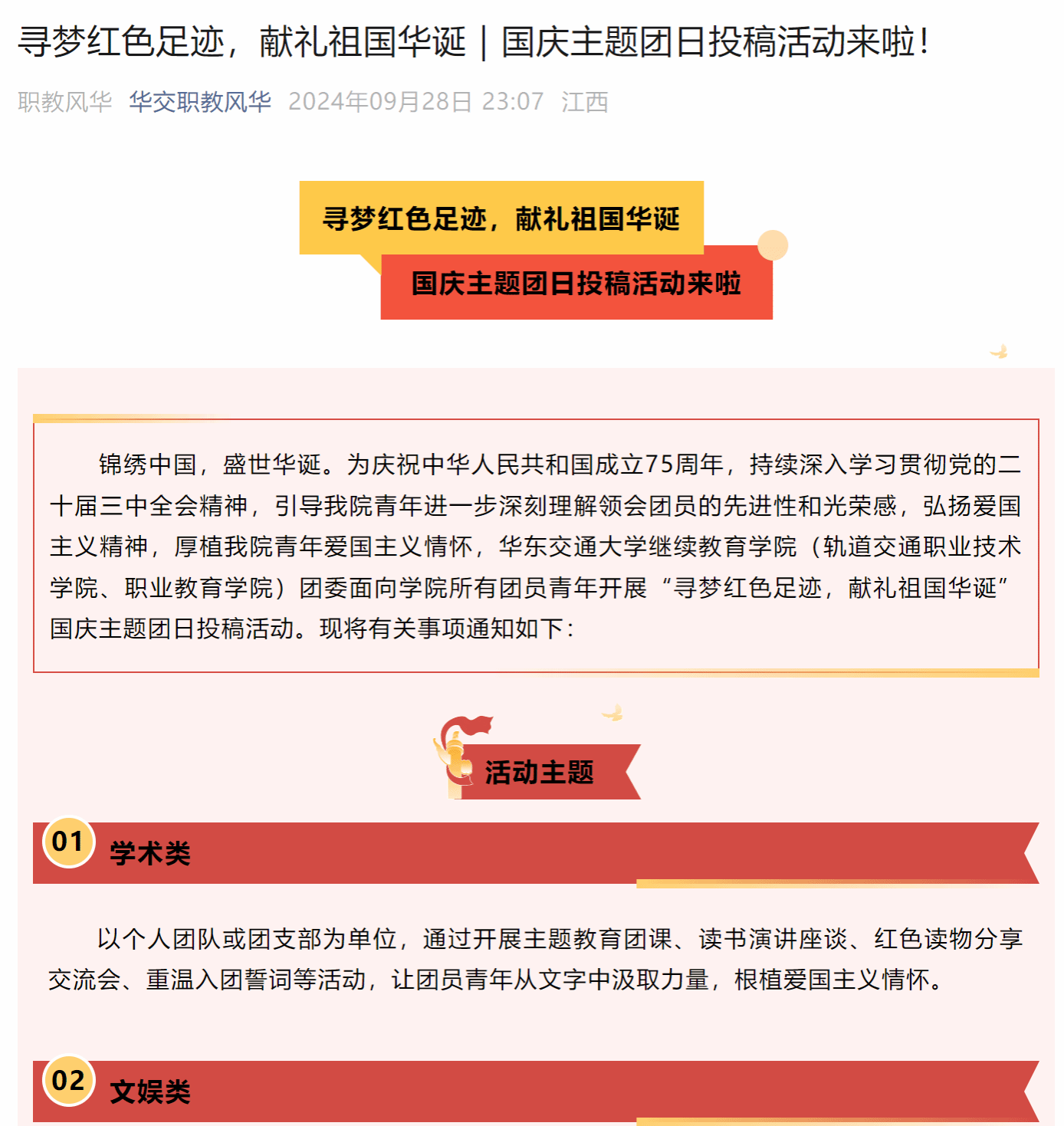 为庆祝中华人民共和国成立75周年,持续深入学习贯彻党的二十届三中全会精神,引导公司青年进一步深刻理解领会团员的先进性和光荣感,弘扬爱国主义精神,厚植公司青年爱国主义情怀,公司团委面向公司所有团员青年开展“寻梦红色足迹,献礼祖国华诞”国庆主题团日投稿活动。