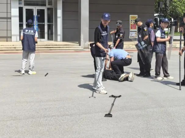 本次演练采取现场模拟突发事件的形式,2名手持刀斧、棍棒的“歹徒”意欲实施恐怖袭击,在砍伤保安闯入校园后,门岗保安立即联系保卫部(校园110),启动应急预案呼叫由护卫队组建的应急防暴处突组前去支援,在和“歹徒”展开周旋的同时迅速报警请求警方增援并拨打三阳集乡卫生院请求抢救受伤人员。在警方到达现场后立即联合保卫部与护卫队对“歹徒”展开包夹攻势,经过协同作战,成功将“歹徒”制服。